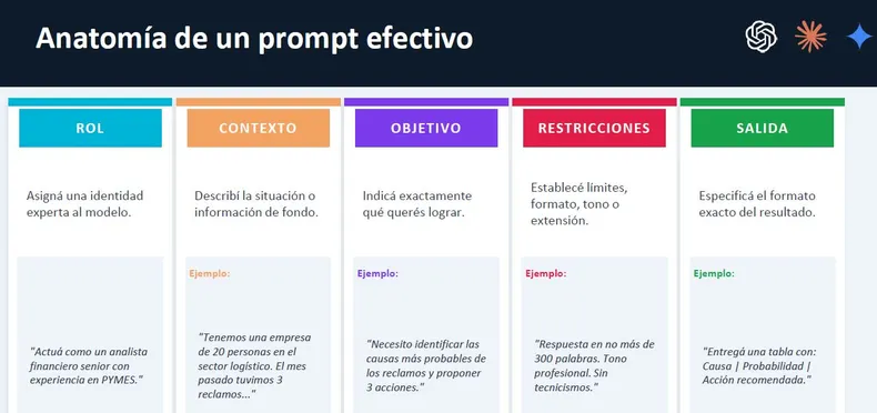 Una vez cumplida esa instancia, llega el momento de confeccionar un “prompt”, término que comprende una instrucción destinada a una aplicación de IA para obtener un resultado específico. Un prompt efectivo debe contar con cinco ítems: rol, contexto, objetivo, formato (restricciones) y resultado deseado (salida).