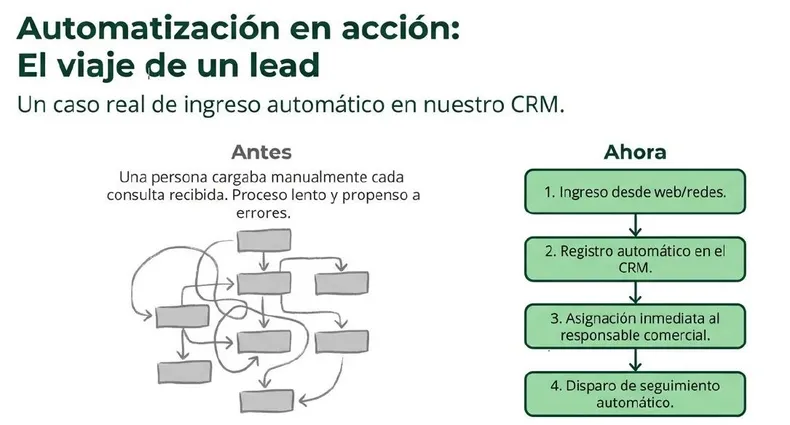 Un caso concreto de automatización por medio de IA es la eficientización de la gestión del relacionamiento con los clientes (CRM). Las consultas recibidas a través de los diferentes canales de comunicación digitales se cargan de manera automática en la plataforma para ser derivadas al responsable comercial correspondiente. Cada consulta tiene asignado un seguimiento automático para poder monitorearla.
