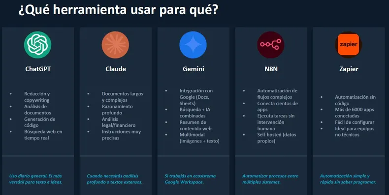 Las diferentes aplicaciones de IA disponibles, –ChatGPT, Gemini, Claude, N8N y Zapier– tienen factores en común, pero también capacidades específicas que pueden ser más útiles en uno que en otro caso dependiendo de la naturaleza y la complejidad de la tarea por realizar.