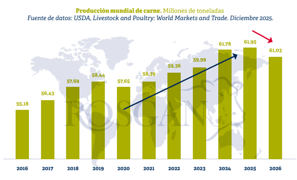 Sin embargo, de manera sorpresiva, al momento de publicarse este informe —y tras varias semanas de retraso en su difusión debido al cierre temporal de los servicios oficiales— el USDA finalmente dio a conocer sus proyecciones sobre producción y comercio mundial de carnes para el próximo ciclo, confirmando la caída anticipada. Este ajuste resulta particularmente relevante, ya que marca el fin de un prolongado período de crecimiento de la producción global registrado durante los últimos cinco años.