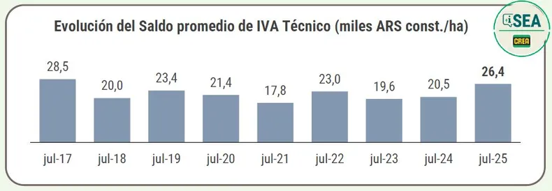 Según la Encuesta SEA realizada en el pasado mes de julio en el ámbito de la red CREA, el saldo de IVA técnico promedio estimado que poseen las empresas consultadas era 26.400 $/ha (unos 21 u$s/ha). Se trata, en pesos constantes (ajustados por inflación), de la cifra más elevada desde julio 2017.
